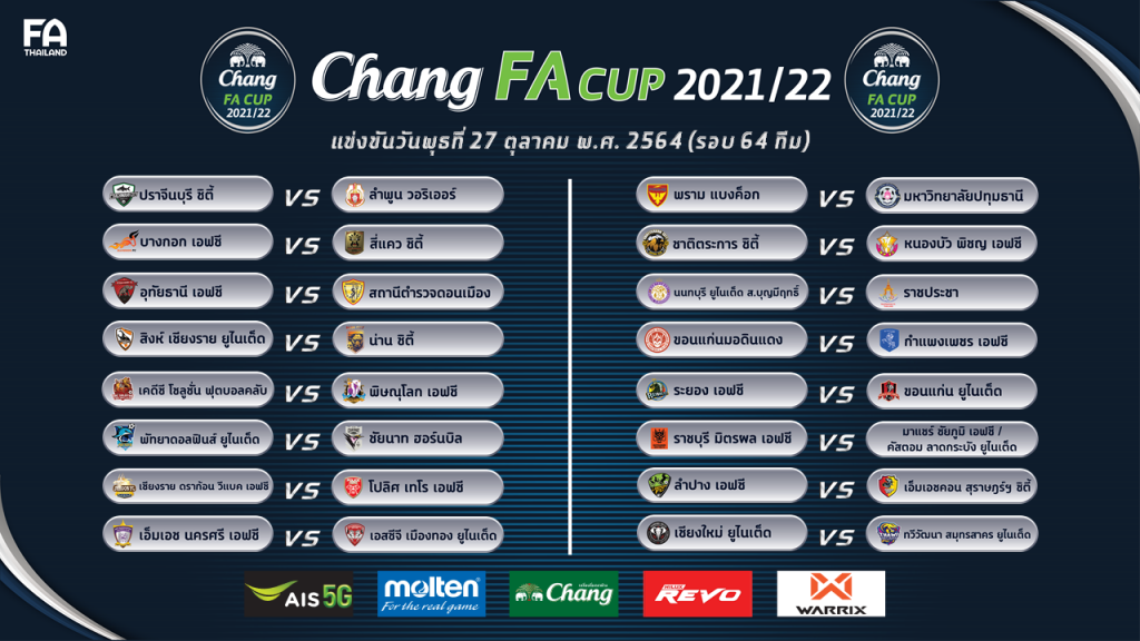 สำหรับ ผลการจับฉลาก “ช้าง เอฟเอ คัพ 2021/22” รอบ 64 ทีมสุดท้าย ที่มีโปรแกรมแข่งขันในวันที่ 27 ตุลาคม 2564 มีดังนี้