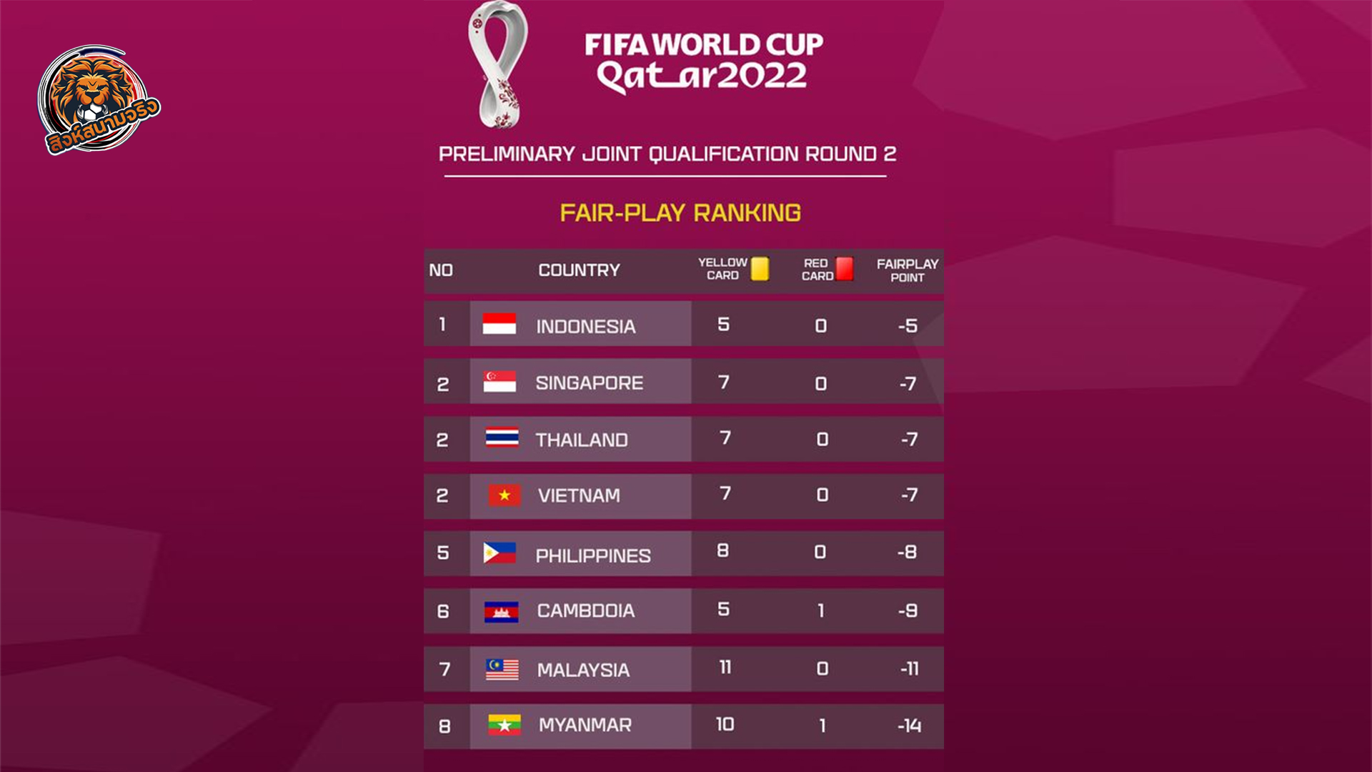 “ช้างศึก” รั้ง ทีมแฟร์-เพลย์ อันดับ 2 ร่วม คัดบอลโลก โซน “อาเซียน”