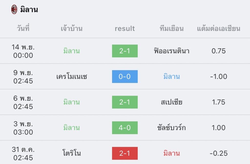 สถิติ 5 นัด เอซี มิลาน